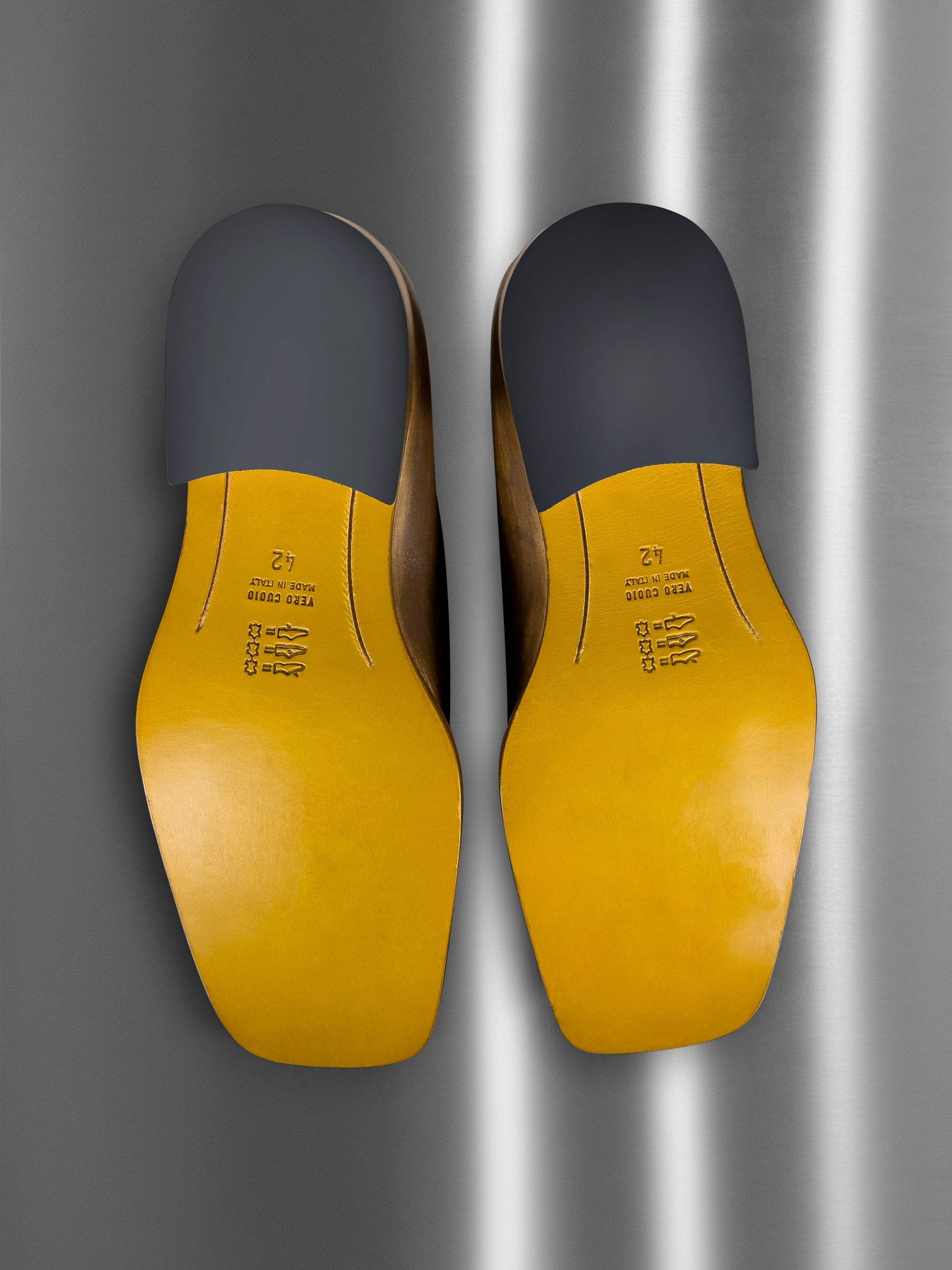 Brown Derby shoes with a long and slim squared toe. This understated design blends contemporary tones with a nod to classic structure and elegance. Entirely crafted from leather and hide, it is hand painted and it offers striking simplicity and a uniquely composed presence.