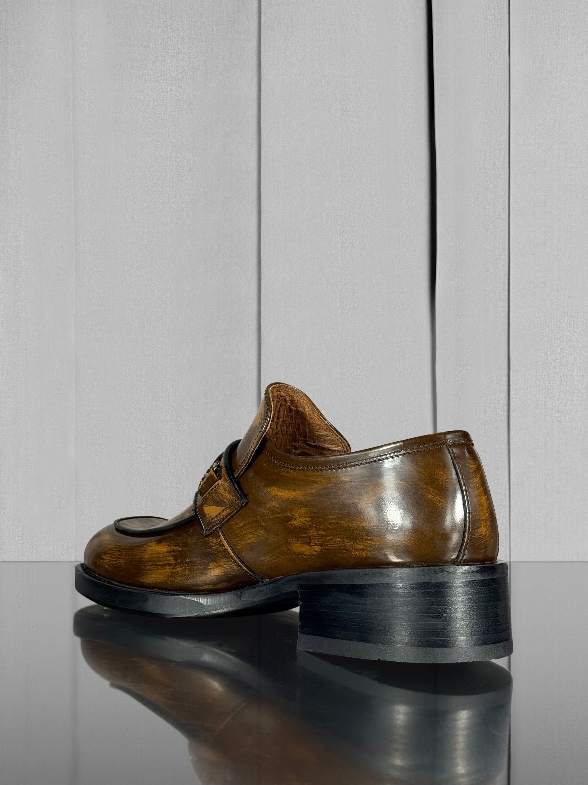 Loafer in hand-painted antique ochre leather, featuring a brushed patina finish that creates a unique interplay of light and shadow across the surface.