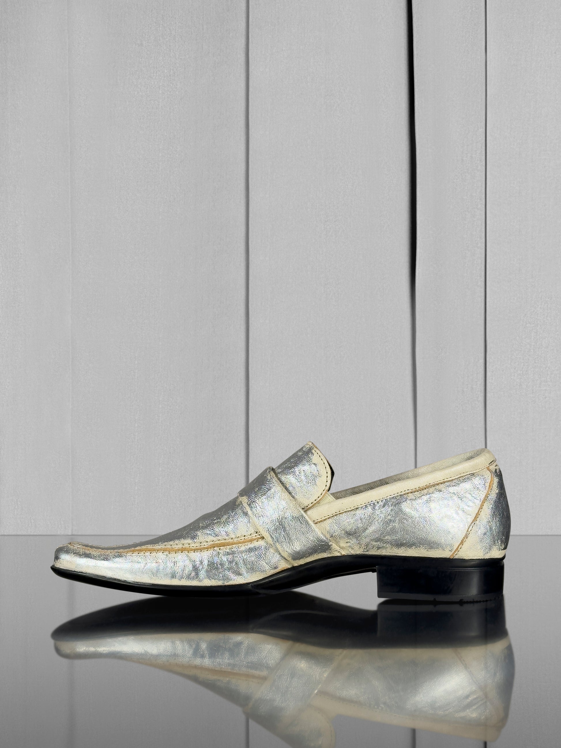 Pointed loafer in brushed silver leather, featuring a side buckle and a rectangular metal detail. The silhouette is sleek and bold, with the silver leather catching the light for a striking, luminous effect.