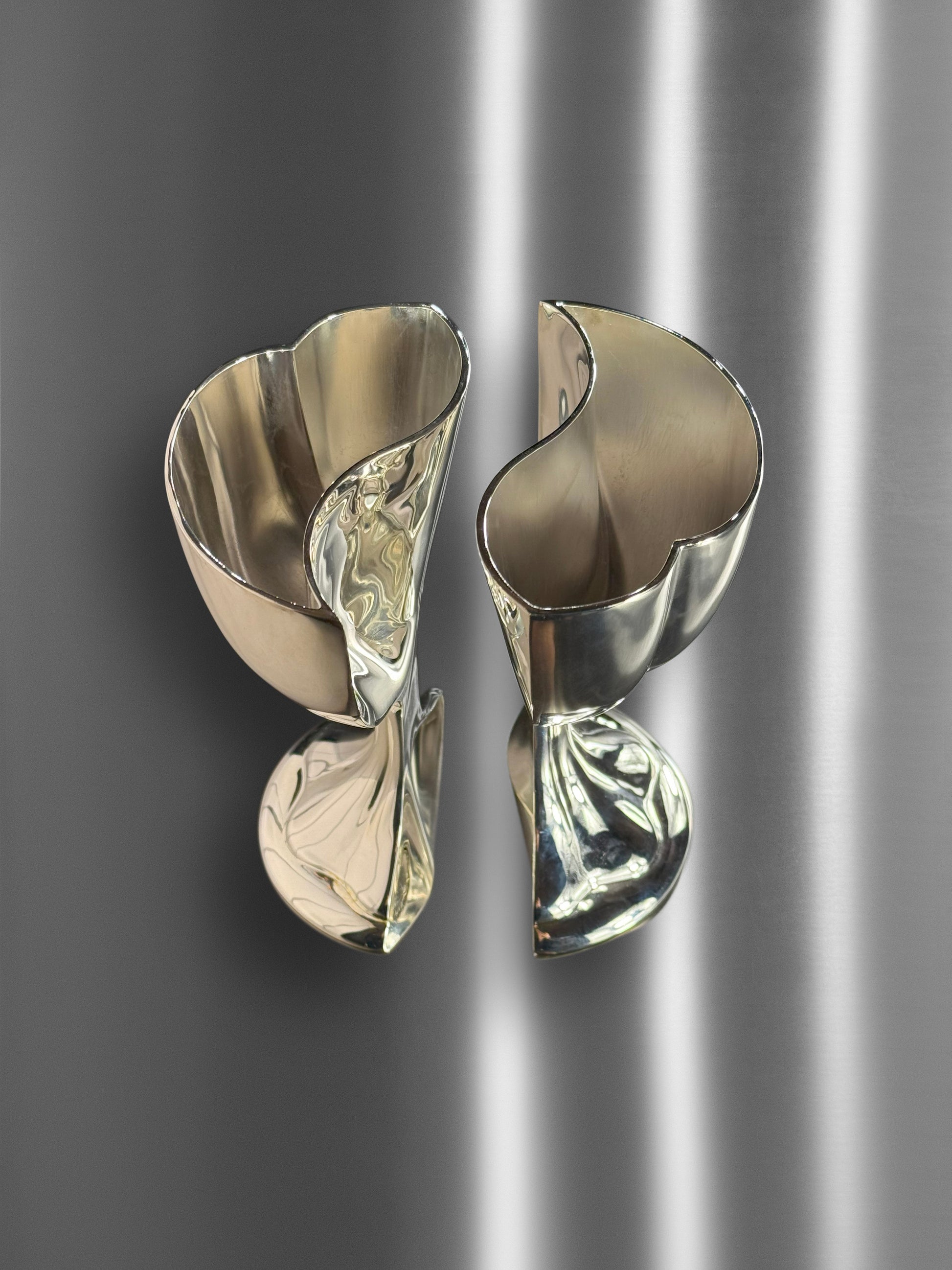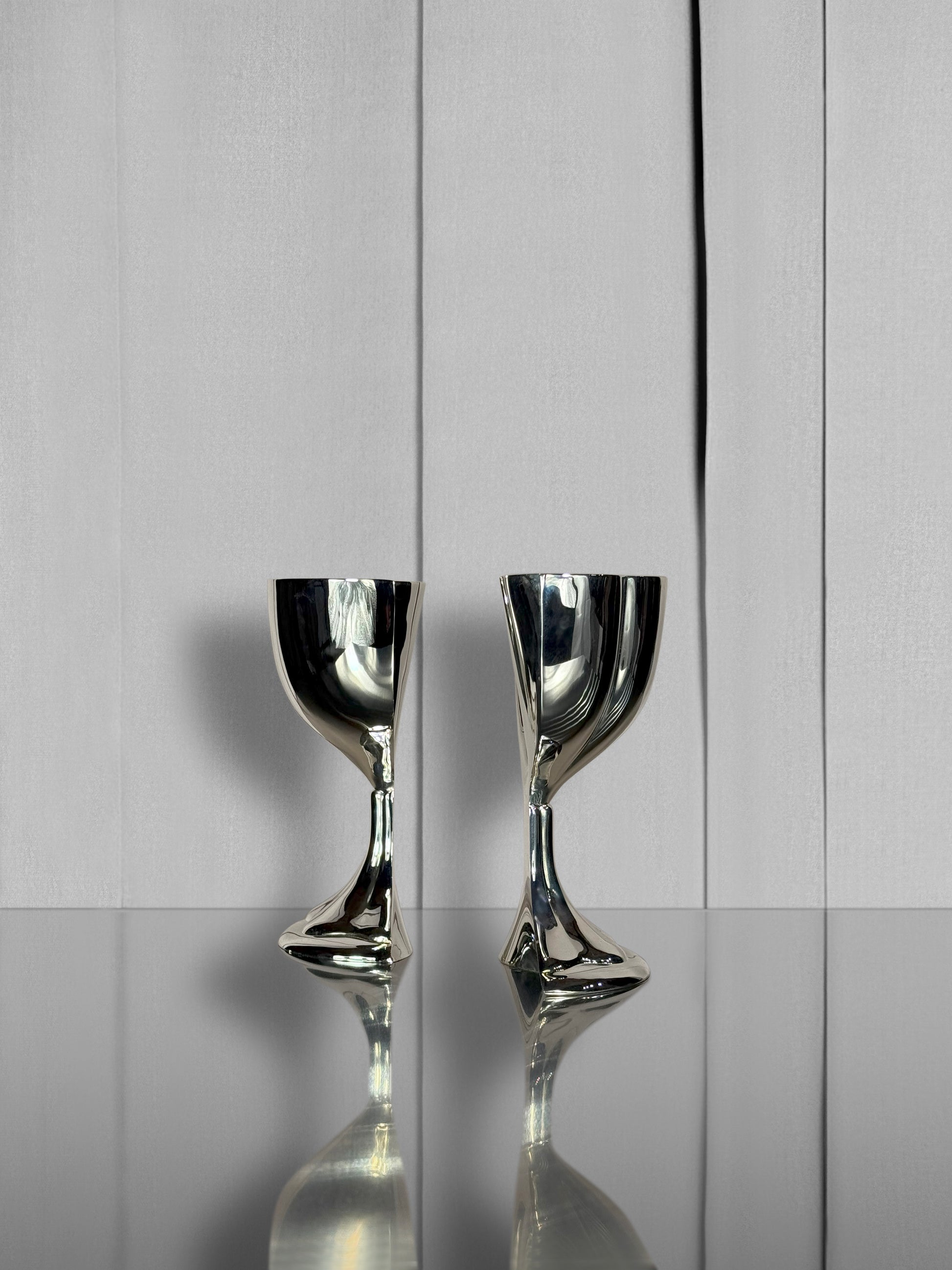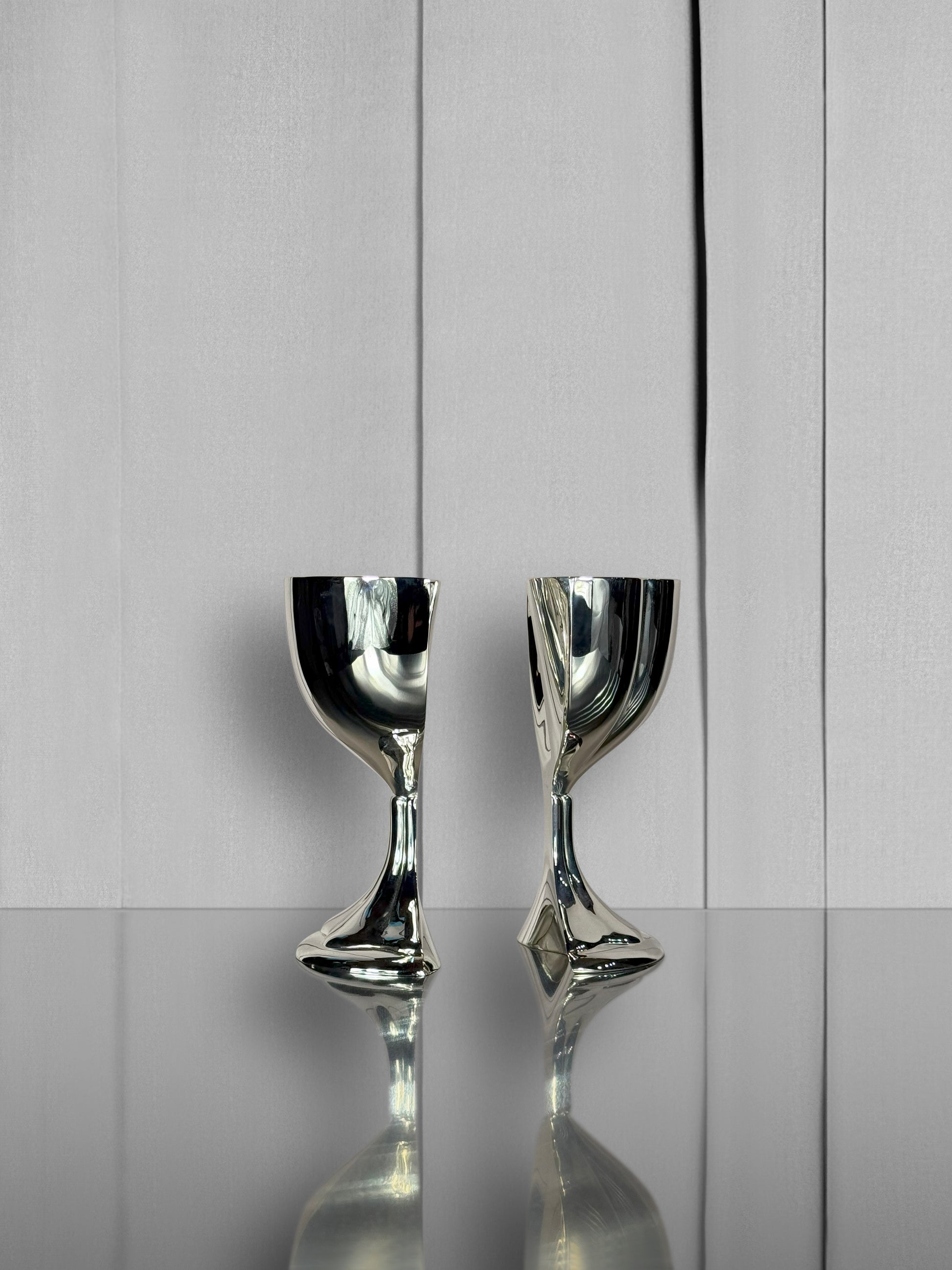 Its weight provides a strong, steady presence, making it both striking and sculptural. The reflections, highlighted by the concave and convex curves of the steel, give the chalice an intriguing visual appeal, while its design adds a celebratory touch to any space.