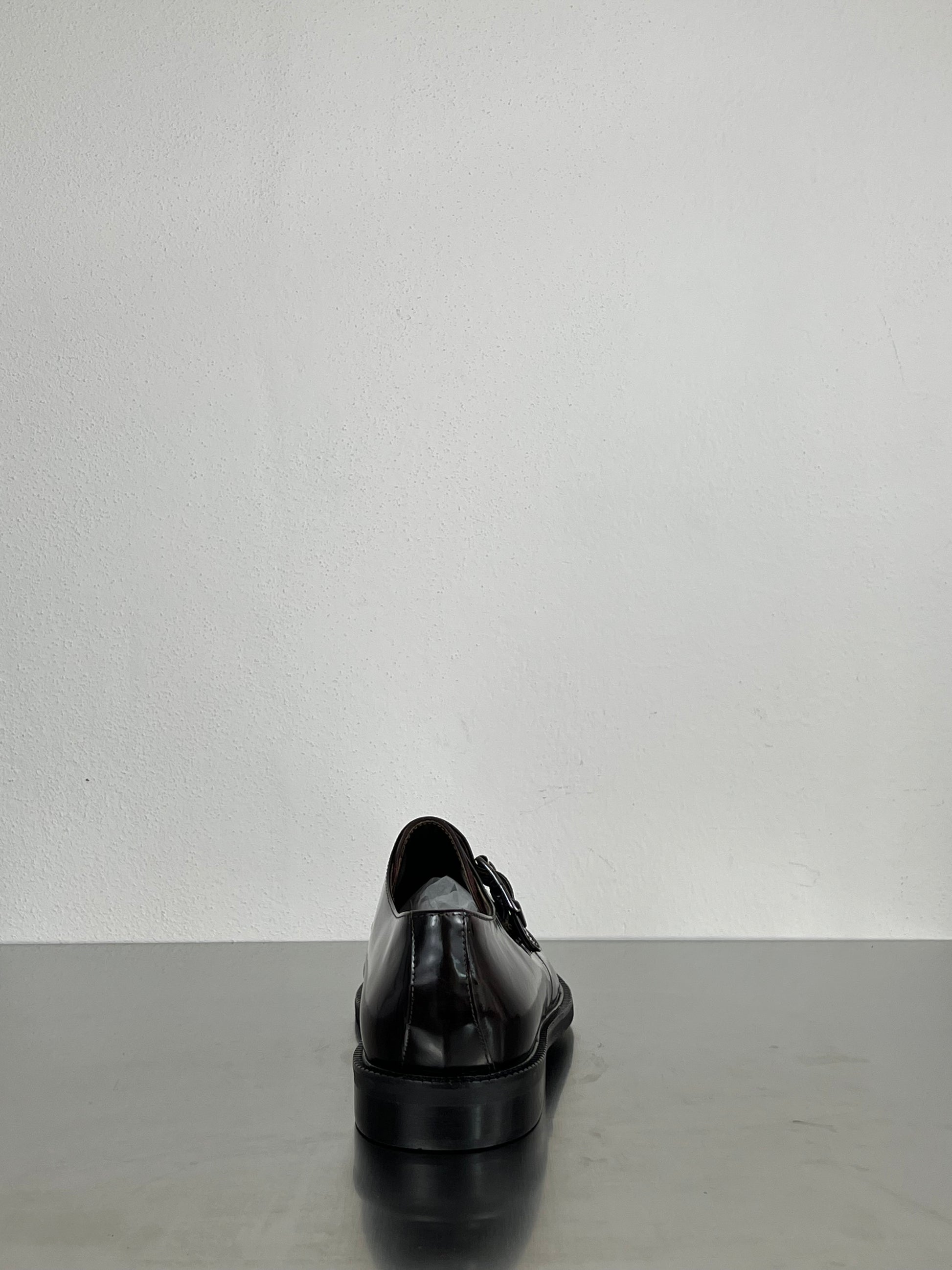 Crafted in Italy from hand-polished calf leather, this single-buckle monk strap reveals deep shades of burgundy and black, shaped by light. The squared toe and clean vamp underline a precise, architectural silhouette. Built on a durable leather sole, it balances formality and ease — made to age beautifully with every step.